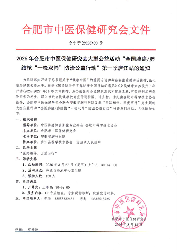 2026年合肥市中医保健研究会大型公益活动“全国肺癌/肺结核“一检双筛”防治公益行动”第一季庐江站的通知