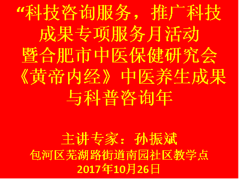 2017年10月26日上午9点合肥市中医保健研究会根椐合肥市民政局,合肥市科学技术协会关于在全市开展“科普咨询服务,推广科技成果”专项服务月活动精神,由研究会秘书长孙振斌在包河区芜湖路街道南园社区开展中医养生科技成果推广普咨询服务,讲座结束时大家纷纷向孙秘书长咨询相关中医养生的知识与实用方法,秘书长一一向前来咨询的社区居民做了详细解达,现场咨询达20人左右。