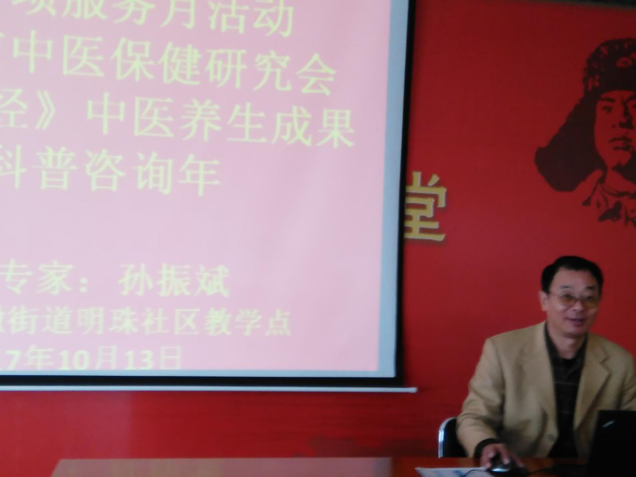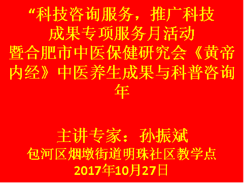 为贯彻国家召开的健康卫生大会和习近平主席在会上说“没有全民健康就没有全民小康”和健康中国2030规划纲要的精神,结合当前科技咨询服务,推广科技成果服务月活动,合肥市中医保健研究会配合合肥市社区科普大学的工作,于2017年10月27日在合肥市包河区滨湖明珠社居委由合肥市中医保健研究会秘书长孙振斌同志开展中医养生成果推广咨询服务专项活动,参加学习的社区居民有十几人,学习兴趋及高。